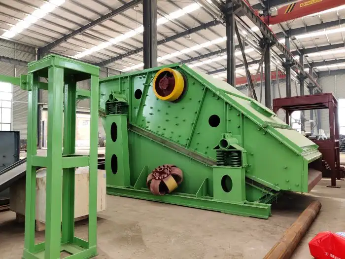 產品概述: 圓振動篩采用偏心軸作為激振動力,利用電機帶動偏心軸旋轉后聯動振動篩做上,前,下,后的圓運動軌跡,使被篩分物料均勻,快速溜過篩網而完成篩分工作。適宜采石場篩分砂石料,也可供選煤、選礦、建材、電力及化工等行業作產品分級用。主要由篩箱、篩網、振動器及減振彈簧等組成。振動器安裝在篩箱側板上,并由電機通過聯軸器帶動旋轉,產生離心慣性力,迫使篩箱振動。對于本系列振動篩篩網是主要易損件。根據物